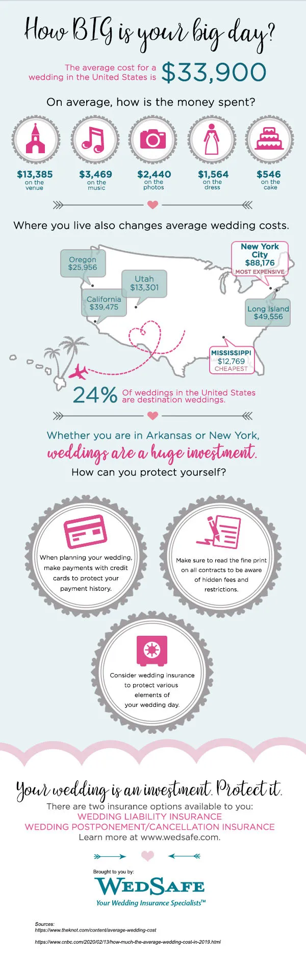 You can get coverage appropriate to the investment you’ve made (ie, your wedding budget.) Liability policy costs depend on the amount of coverage you choose to release you from responsibility in case of accidents. WedSafe has options to suit a range of wedding sizes and coverage needs. So whether you’re spending $5,000 or $50,000 you’ll be able to protect your financial investment with their plans.