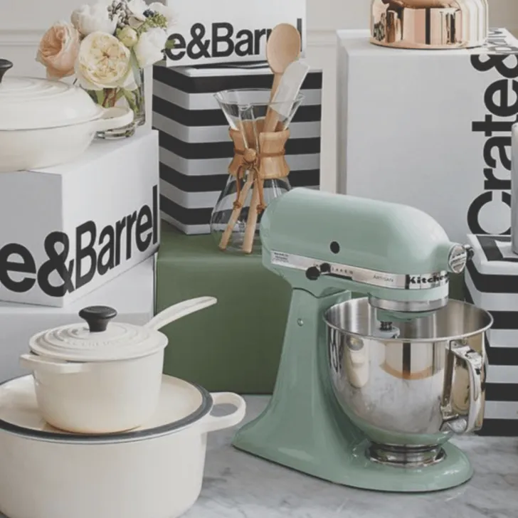 - If you’re still using a couch that you scored from Goodwill, Crate & Barrel is your ticket to adult furniture. This is where you can register for your grown-up dishes that all fit a modern, clean aesthetic.
