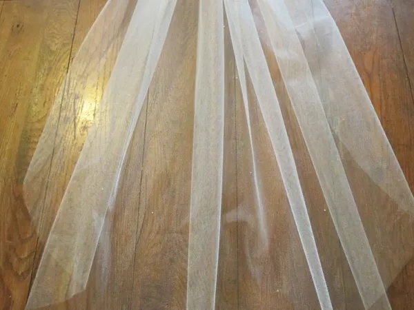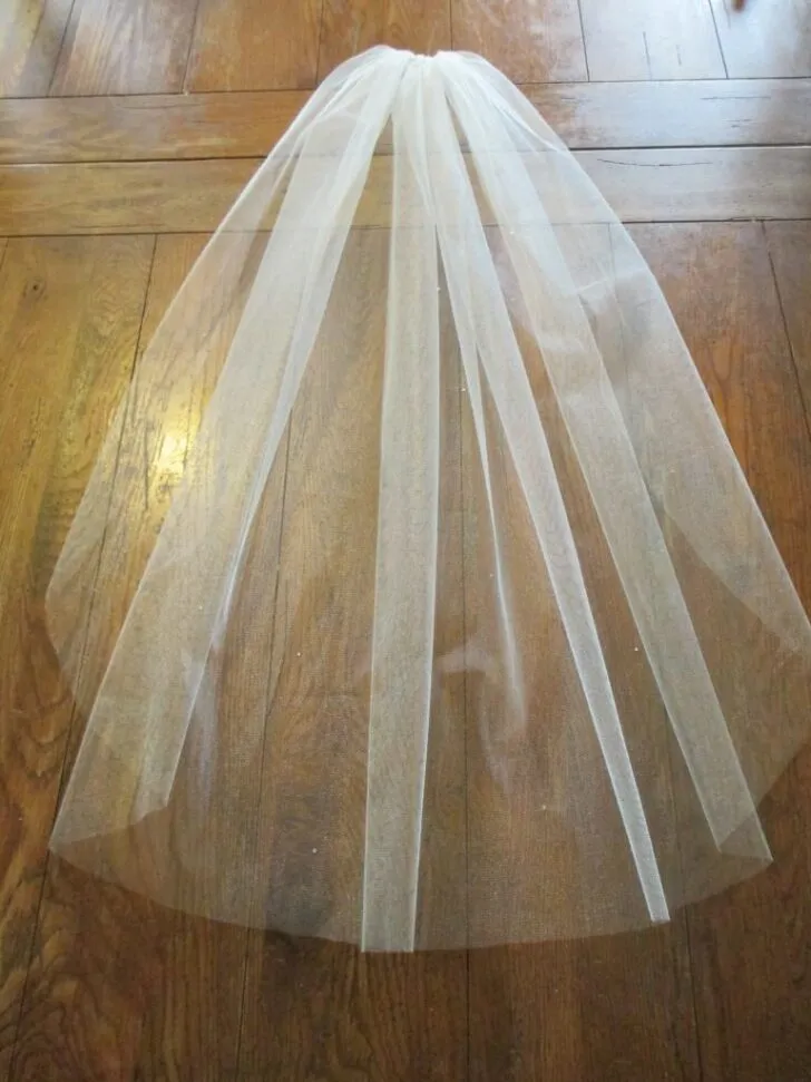 - I bought my tulle 54″ wide because I want it wispier. However, if you want a poofier veil, buy 108″ wide.