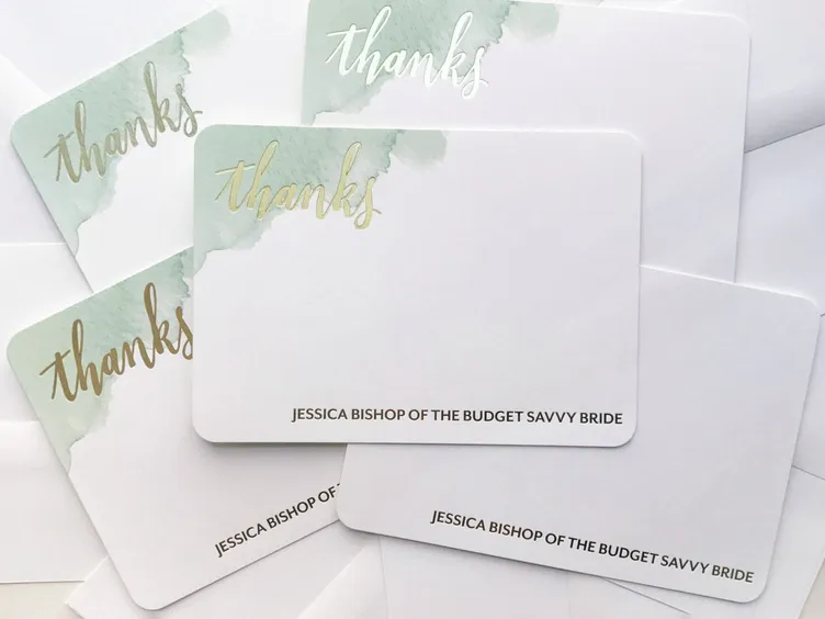Even before you start receiving gifts, it’s important to stock up on stationery so that you have the supplies you need to send your thank you notes in an efficient manner. I love the personalized stationery you can find at Shutterfly! They have styles for every occasion — choose from gorgeous graphic designs or even include a photo if you’d like! Whether you’re looking for stationery for yourself or for you and your partner to use for joint thank-you’s, you’ll find whatever you need! You’ll likely want to stock up on some of each. Want to make sure you can use your stationery before and after the big day? Leave your last names off your stationery so that you can continue using whatever you have leftover after the wedding day.
