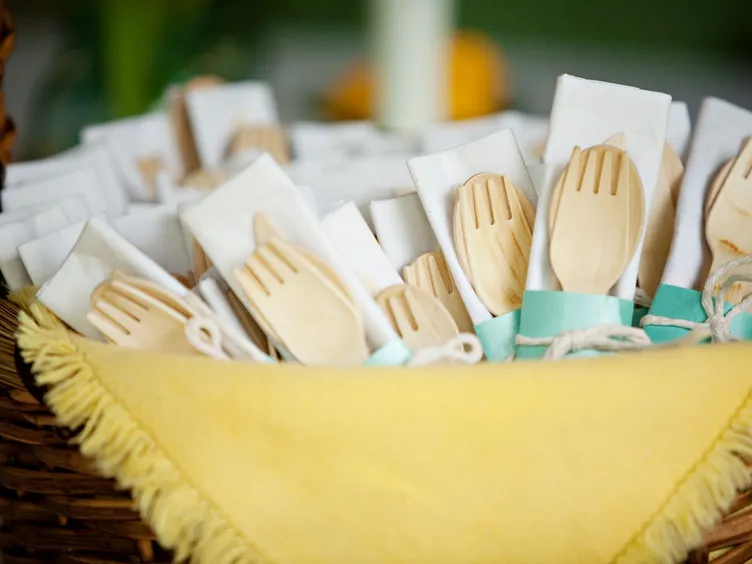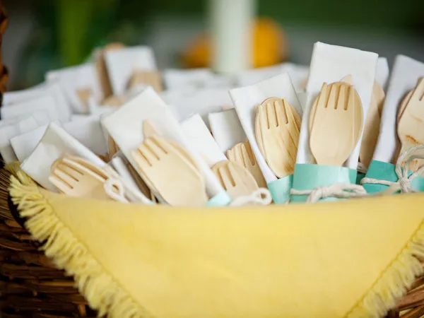 If you’re looking for a cheap alternative to renting real silverware (while still being eco-friendly!) consider using wooden cutlery or other compostable tableware for your wedding reception meal.