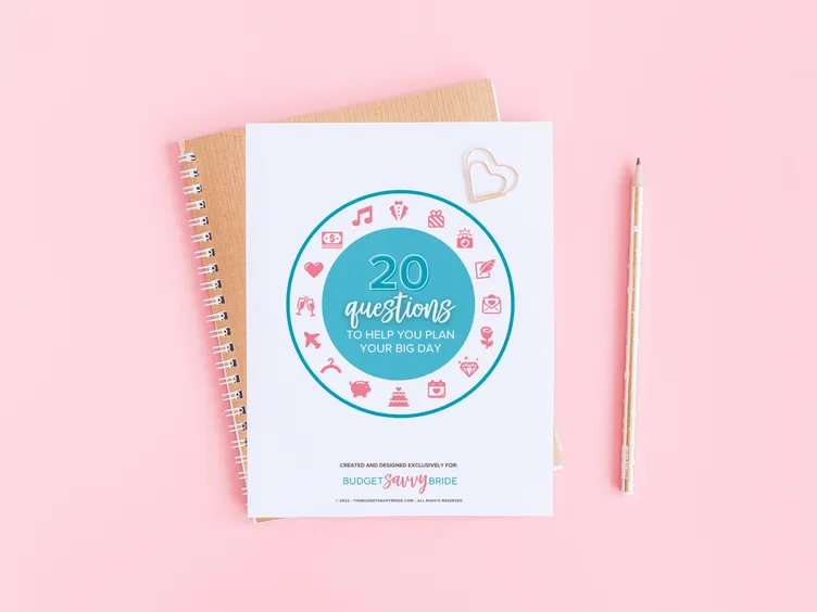The 20 Questions of Wedding Planning is a series of question cards and worksheets for you and your fiancé to fill out. Once you’ve answered all the questions and filled out your worksheets, you can compare and contrast your responses to help reach the perfect compromise for your wedding plans!